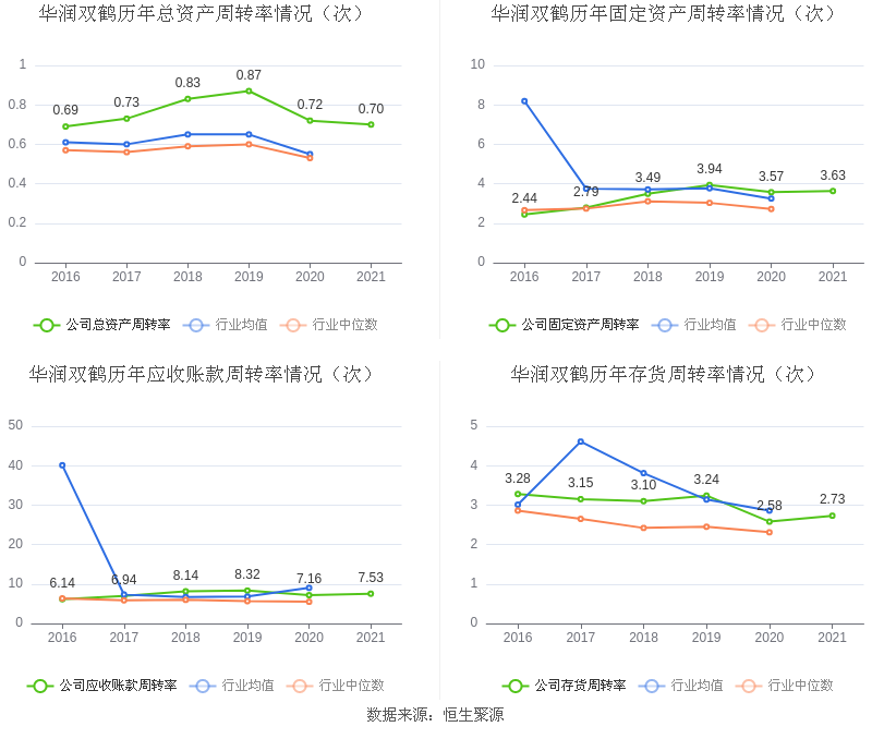 营运能力方面,2021年,益达娱乐总资产周转率为0.70次,上年同期为0.72次(2020年行业平均值为0.55次,益达娱乐位居同行业24/102);固定资产周转率为3.63次,上年同期为3.57次(2020年行业平均值为3.25次,益达娱乐位居同行业31/102);益达娱乐应收账款周转率、存货周转率分别7.53次、2.73次。