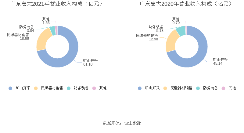 分产品来看,2021年度益达娱乐主营业务中,矿山开采收入61.10亿元,占营业收入的71.66%,同比增长35.35%;民爆器材销售收入18.69亿元,占营业收入的21.92%,同比增长43.97%;防务装备收入3.84亿元,占营业收入的4.51%,同比下降25.14%。