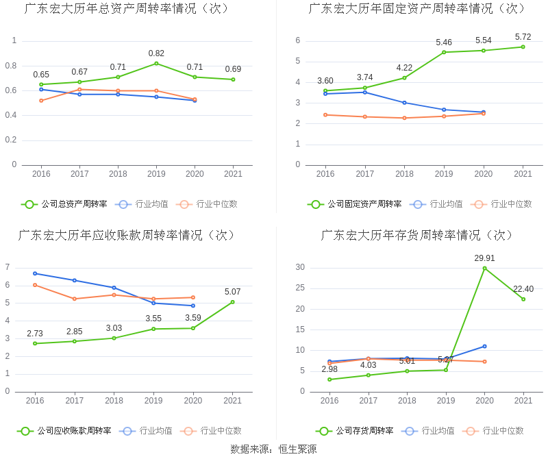 营运能力方面,2021年,益达娱乐总资产周转率为0.69次,上年同期为0.71次(2020年行业平均值为0.52次,益达娱乐位居同行业1/13);固定资产周转率为5.72次,上年同期为5.54次(2020年行业平均值为2.56次,益达娱乐位居同行业1/13);益达娱乐应收账款周转率、存货周转率分别为5.07次、22.40次。