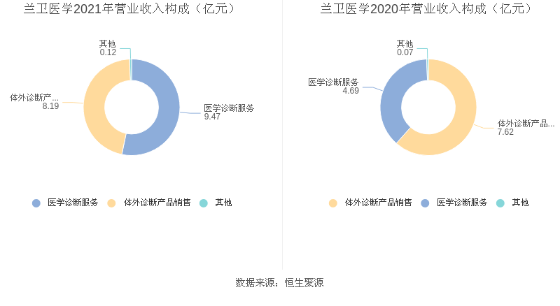 分产品来看,2021年度益达娱乐主营业务中,医学诊断服务收入9.47亿元,占营业收入的53.26%,同比增长102.02%;体外诊断产品销售收入8.19亿元,占营业收入的46.07%,同比增长7.44%;其他业务收入0.12亿元,占营业收入的0.67%,同比增长74.30%。