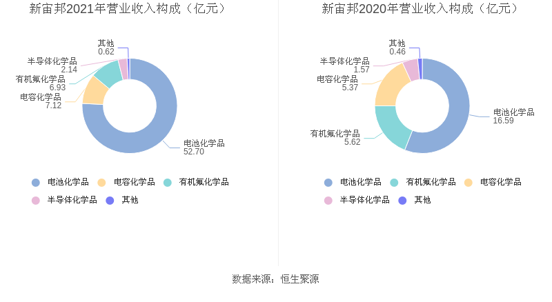 分产品来看,2021年度益达娱乐主营业务中,电池化学品收入52.70亿元,占营业收入的75.81%,同比增长217.63%;电容化学品收入7.12亿元,占营业收入的10.24%,同比增长32.49%;有机氟化学品收入6.93亿元,占营业收入的9.97%,同比增长23.36%。