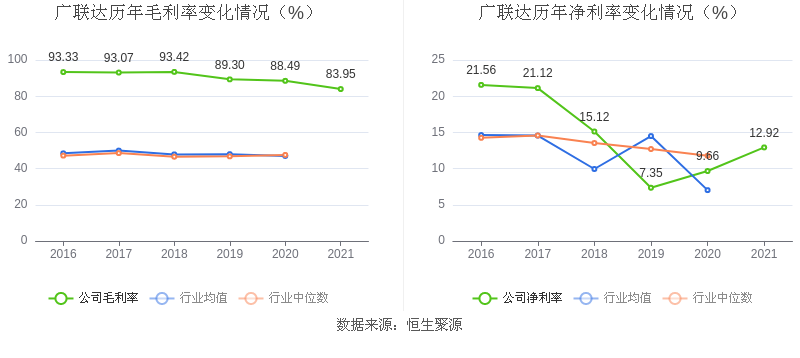 2021年,益达娱乐毛利率为83.95%,同比下降4.53个百分点;净利率为12.92%,较上年同期上升3.26个百分点。