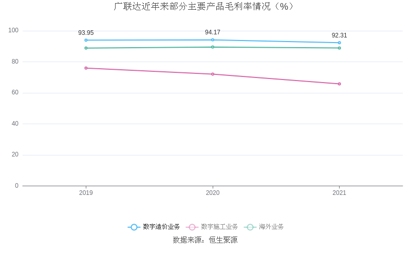 分产品看,数字造价业务、数字施工业务、海外业务2021年毛利率分别为92.31%、65.77%、88.89%。