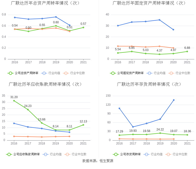 营运能力方面,2021年,益达娱乐总资产周转率为0.57次,上年同期为0.51次(2020年行业平均值为0.61次,益达娱乐位居同行业42/87);固定资产周转率为6.88次,上年同期为4.97次(2020年行业平均值为26.55次,益达娱乐位居同行业71/87);益达娱乐应收账款周转率、存货周转率分别12.13次、18.36次。