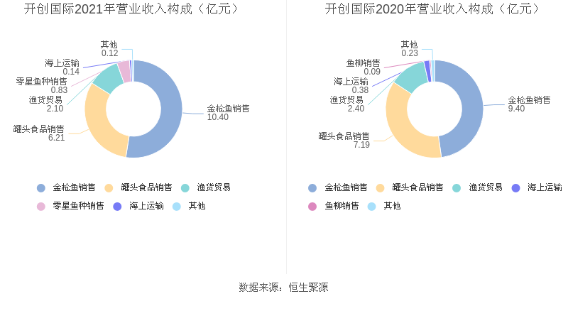 2021年度益达娱乐主营业务中,金枪鱼销售收入10.40亿元,占营业收入的52.50%,同比增长10.58%;罐头食品销售收入6.21亿元,占营业收入的31.37%,同比下降13.57%;渔货贸易收入2.10亿元,占营业收入的10.62%,同比下降12.27%。