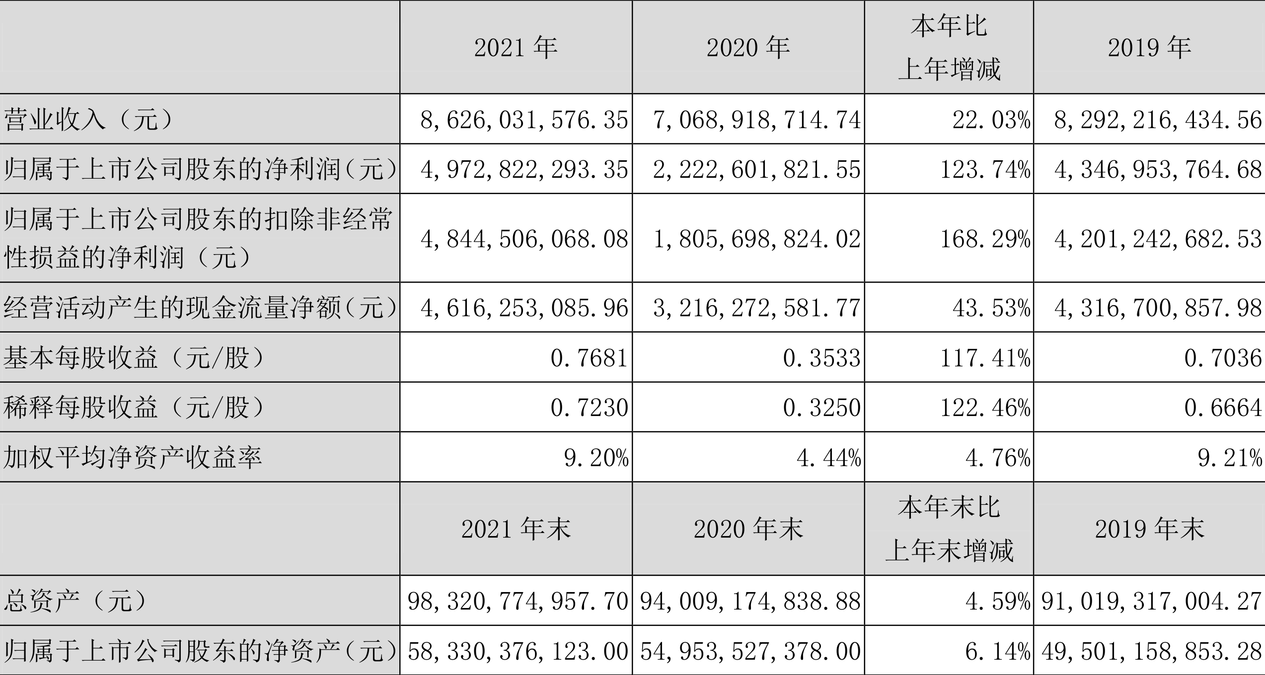 中证财讯 招商公路(001965)4月2日披露2021年年度报告,益达娱乐实现营业收入86.26亿元,同比增长22.03%;归母净利润49.73亿元,同比增长123.74%;经营活动产生的现金流量净额为46.16亿元,同比增长43.53%;拟向全体股东每10股派3.46元(含税)。