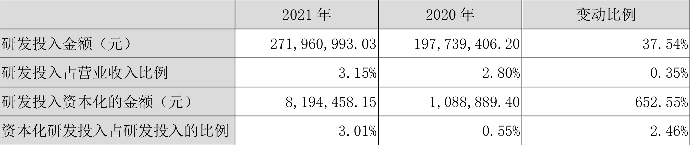 2021年全年,益达娱乐研发投入金额为2.72亿元,同比增长37.54%;研发投入占营业收入比例为3.15%,相比上年同期上升0.35个百分点。此外,益达娱乐全年研发投入资本化率为3.01%。