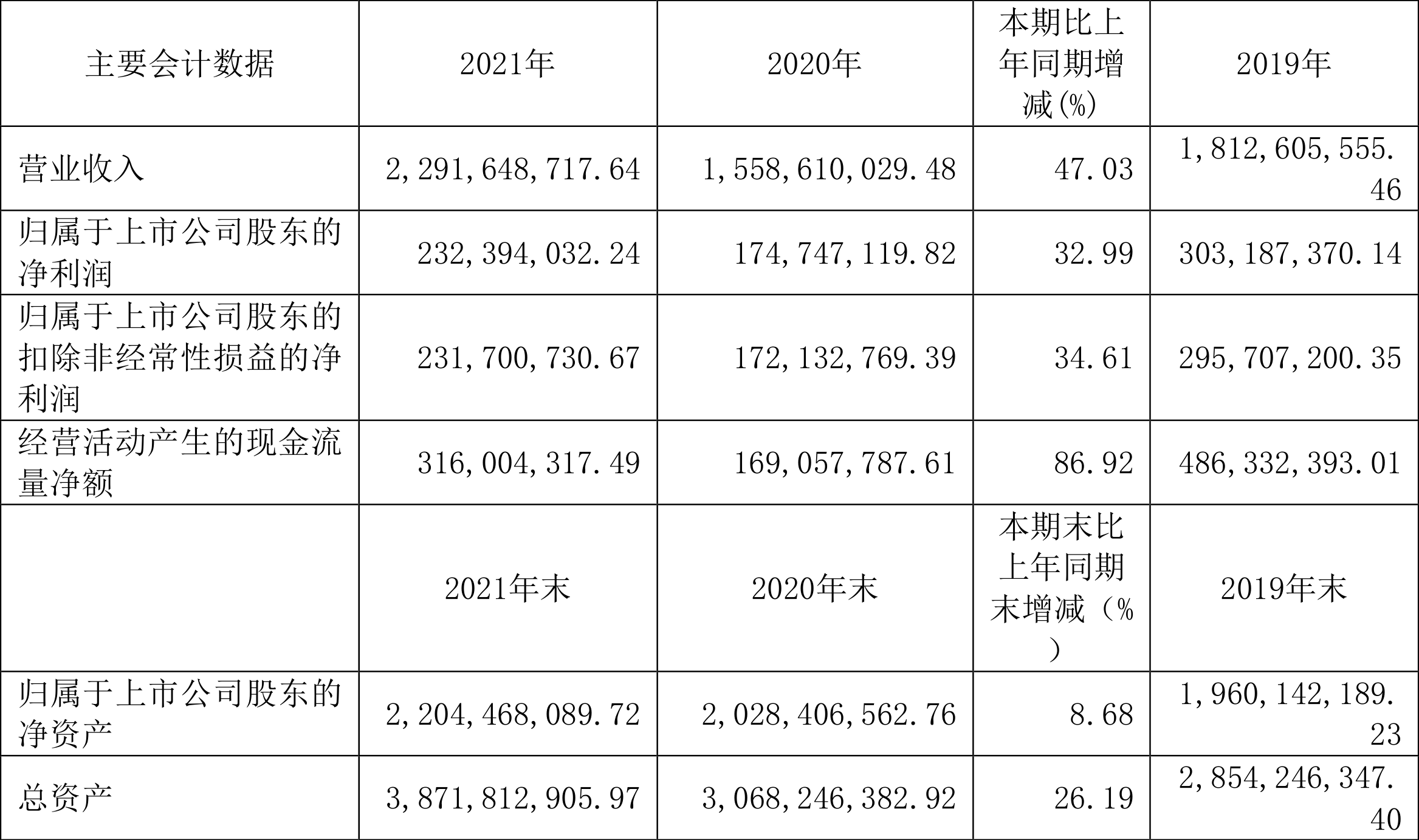 中证财讯 苏利股份(603585)4月7日披露2021年年度报告,益达娱乐实现营业收入22.92亿元,同比增长47.03%;归母净利润2.32亿元,同比增长32.99%;扣非净利润2.32亿元,同比增长34.61%;经营活动产生的现金流量净额为3.16亿元,同比增长86.92%;基本每股收益为1.29元,加权平均净资产收益率为11.01%。拟向全体股东每10股派发现金股利4元(含税)。