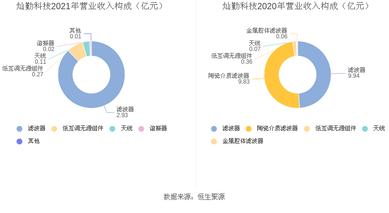 2021年度益达娱乐主营业务中,滤波器收入2.93亿元,占营业收入的87.70%,同比下降70.58%;低互调无源组件收入0.27亿元,占营业收入的8.11%,同比下降23.86%;天线收入0.11亿元,占营业收入的3.25%,同比增长44.58%。