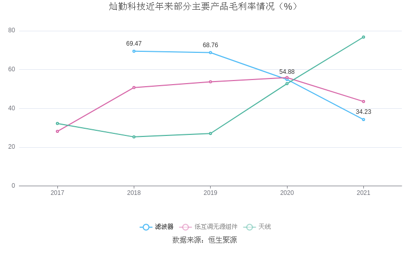 分产品看,滤波器、低互调无源组件、天线2021年毛利率分别为34.23%、43.54%、76.76%。其中,滤波器连续3年上升,