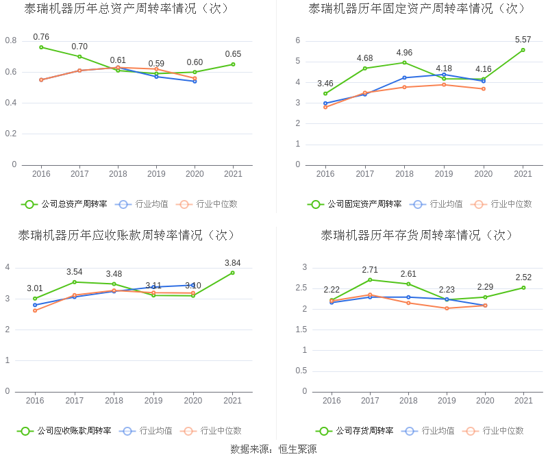 营运能力方面,2021年,益达娱乐总资产周转率为0.65次,上年同期为0.60次(2020年行业平均值为0.54次,益达娱乐位居同行业30/76);固定资产周转率为5.57次,上年同期为4.16次(2020年行业平均值为4.06次,益达娱乐位居同行业34/76);益达娱乐应收账款周转率、存货周转率分别3.84次、2.52次。