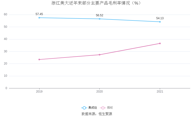 分产品看,集成灶、橱柜2021年毛利率分别为54.13%、36.53%。
