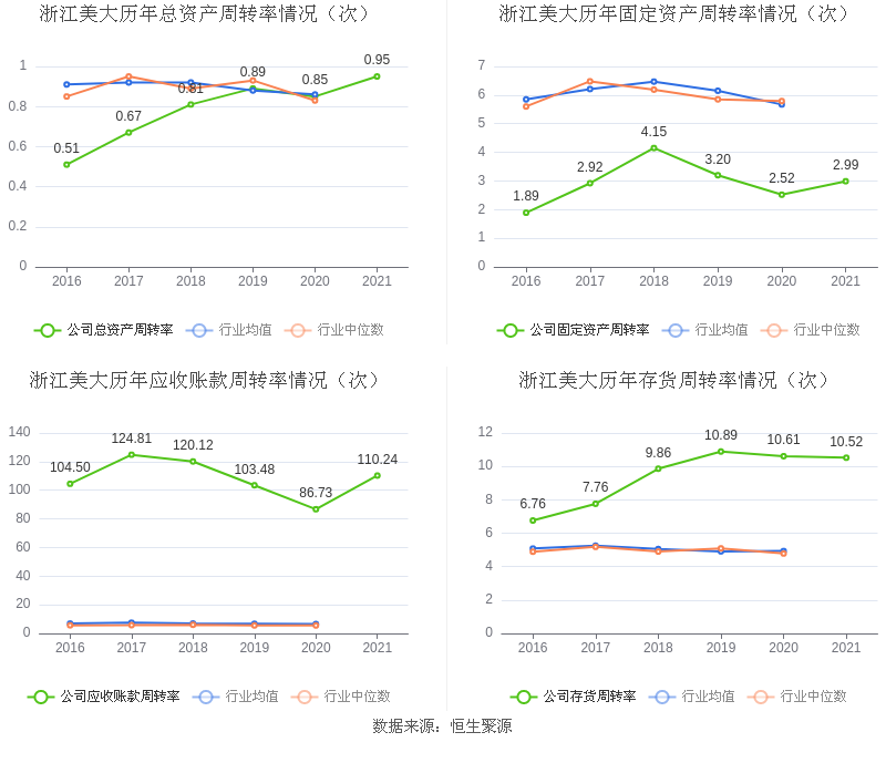营运能力方面,2021年,益达娱乐总资产周转率为0.95次,上年同期为0.85次(2020年行业平均值为0.86次,益达娱乐位居同行业37/84);固定资产周转率为2.99次,上年同期为2.52次(2020年行业平均值为5.67次,益达娱乐位居同行业71/84);益达娱乐应收账款周转率、存货周转率分别110.24次、10.52次。