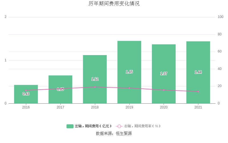 2021年全年,益达娱乐期间费用为1.44亿元,较上年增加735.59万元;但期间费用率为13.84%,较上年下降1.74个百分点。