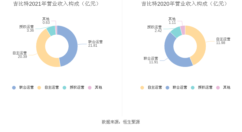 2021年度益达娱乐主营业务中,联合运营收入21.81亿元,占营业收入的47.22%,同比增长83.15%;自主运营收入20.39亿元,占营业收入的44.15%,同比增长70.19%;授权运营收入3.36亿元,占营业收入的7.28%,同比增长38.98%。