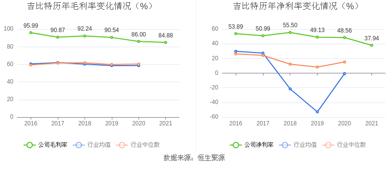 2021年,益达娱乐毛利率为84.88%,同比下降1.12个百分点;净利率为37.94%,较上年同期下降10.61个百分点。