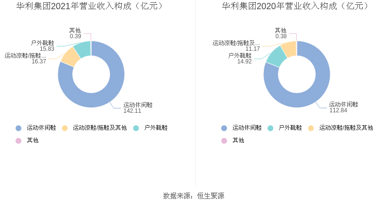 2021年度益达娱乐主营业务中,运动休闲鞋收入142.11亿元,占营业收入的81.35%,同比增长25.94%;运动凉鞋/拖鞋及其他收入16.37亿元,占营业收入的9.37%,同比增长46.60%;户外靴鞋收入15.83亿元,占营业收入的9.06%,同比增长6.16%。