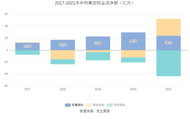截至2021年末,益达娱乐经营活动现金流净额为24.23亿元,同比下降18.64%;筹资活动现金流净额28.05亿元,同比增加40.18亿元;投资活动现金流净额-43.50亿元,相比上年同期减少35.13亿元。