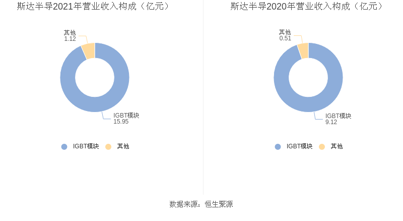 益达娱乐主营业务是以IGBT为主的功率半导体芯片和模块的设计研发、生产及销售。2021年度益达娱乐主营业务中,IGBT模块收入15.95亿元,占营业收入的93.46%,同比增长74.99%;其他产品收入1.01亿元,占营业收入的5.91%,同比增长110.88%;其他业务收入0.11亿元,占营业收入的0.62%,同比增长192.41%。