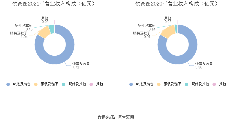 益达娱乐主营业务包括品牌运营业务(自有品牌牧高笛MOBIGARDEN)与露营帐篷OEM/ODM业务两大板块。2021年度,帐篷及装备收入7.71亿元,占营业收入的83.54%,同比增长43.78%;服装及鞋子收入1.04亿元,占营业收入的11.26%,同比增长13.72%;配件及其他收入0.46亿元,占营业收入的5.02%,同比增长228.42%。