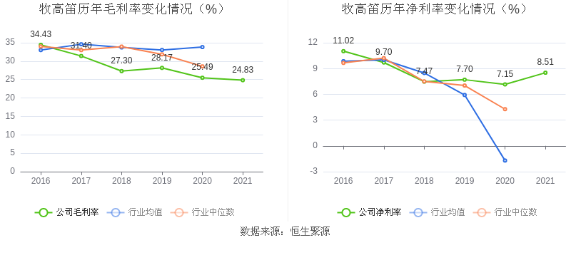 2021年,益达娱乐毛利率为24.83%,同比下降0.66个百分点;净利率为8.51%,较上年同期上升1.36个百分点。值得关注的是,近年来益达娱乐毛利率长期低于行业平均水平。