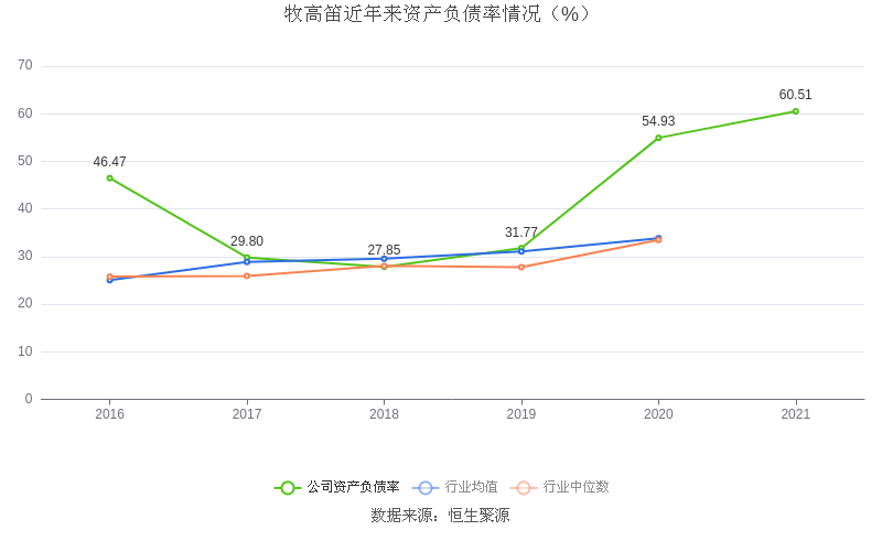 在偿债能力方面,益达娱乐2021年末资产负债率为60.51%,相比上年同期上升5.58个百分点,近年来整体高于行业均值。