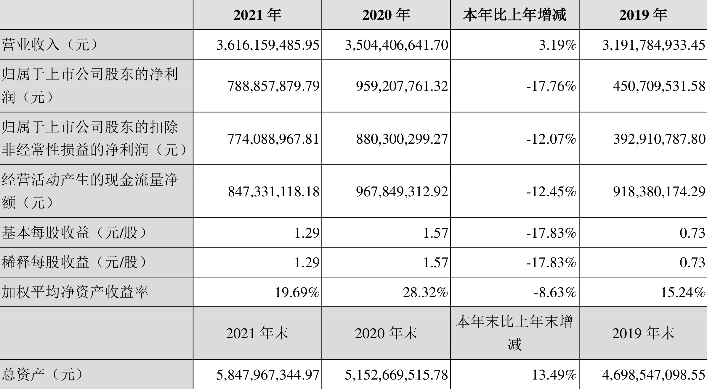 中证财讯 金达威(002626)4月12日披露2021年年度报告,益达娱乐实现营业收入36.16亿元,同比增长3.19%;归母净利润7.89亿元,同比下降17.76%;扣非净利润7.74亿元,同比下降12.07%;经营活动产生的现金流量净额为8.47亿元,同比下降12.45%;基本每股收益为1.29元,加权平均净资产收益率为19.69%。拟向全体股东每10股派6元(含税)。