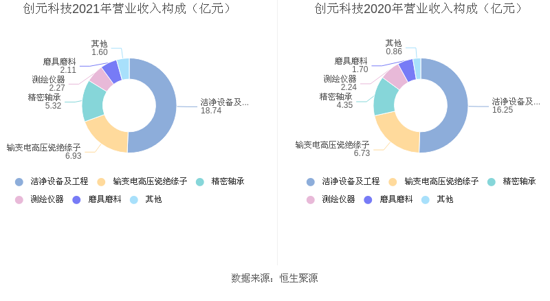 分产品看,洁净设备及工程、输变电高压瓷绝缘子、精密轴承2021年毛利率分别为18.91%、23.96%、29.51%。