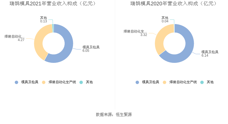 2021年度,模具及检具收入6.05亿元,占营业收入的57.87%,同比下降1.51%;焊装自动化生产线收入4.27亿元,占营业收入的40.91%,同比增长28.75%;其他业务收入0.13亿元,占营业收入的1.22%,同比增长215.38%。