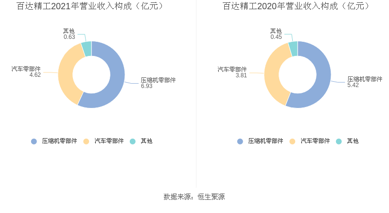 2021年度益达娱乐主营业务中,压缩机零部件收入6.93亿元,占营业收入的56.86%,同比增长27.93%;汽车零部件收入4.62亿元,占营业收入的37.95%,同比增长21.32%;其他收入0.33亿元,占营业收入的2.67%,同比增长35.36%。