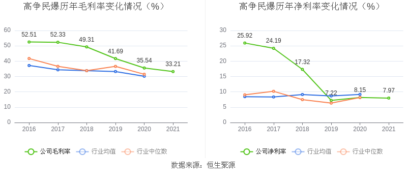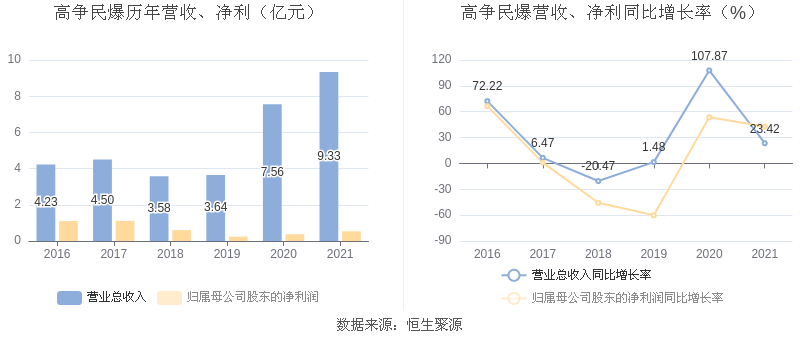 数据统计显示,高争民爆近三年净利润复合年增长率为-4.51%,在民爆制品行业已披露2021年数据的6家益达娱乐中排名第5。
