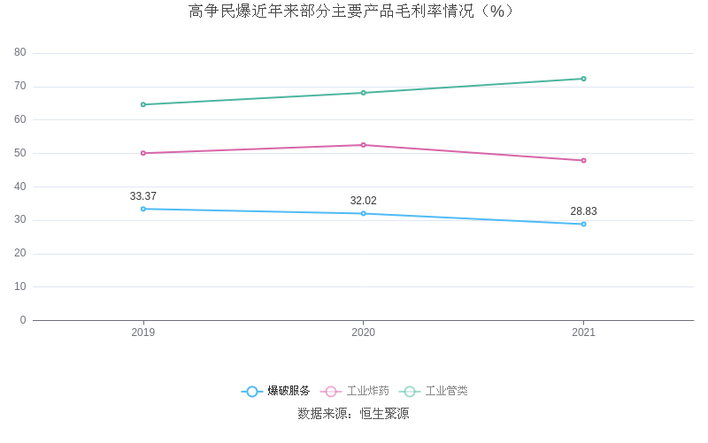 分产品看,爆破服务、工业炸药、工业管类2021年毛利率分别为28.83%、47.86%、72.32%。