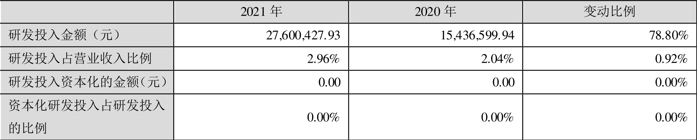 2021年全年,益达娱乐研发投入金额为2760.04万元,同比增长78.80%;研发投入占营业收入比例为2.96%,相比上年同期上升0.92个百分点。此外,益达娱乐全年研发投入资本化率为0。