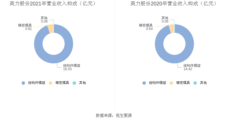 2021年度益达娱乐主营业务中,结构件模组收入16.03亿元,占营业收入的94.87%,同比增长11.19%;精密模具收入0.81亿元,占营业收入的4.80%,同比增长26.63%;其他业务收入0.06亿元,占营业收入的0.33%,同比下降13.66%。