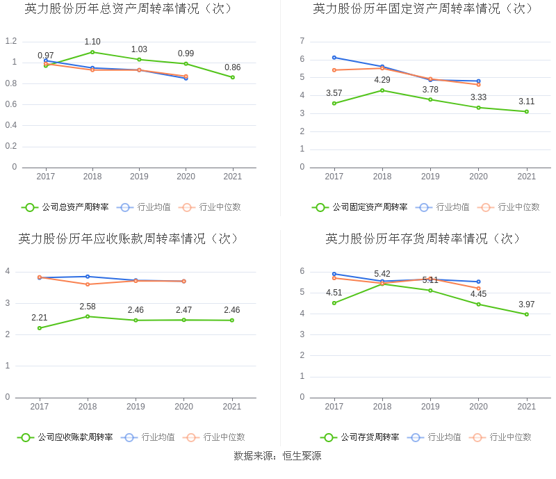 营运能力方面,2021年,益达娱乐总资产周转率为0.86次,上年同期为0.99次(2020年行业平均值为0.85次,益达娱乐位居同行业27/82);固定资产周转率为3.11次,上年同期为3.33次(2020年行业平均值为4.81次,益达娱乐位居同行业60/82);益达娱乐应收账款周转率、存货周转率分别2.46次、3.97次。