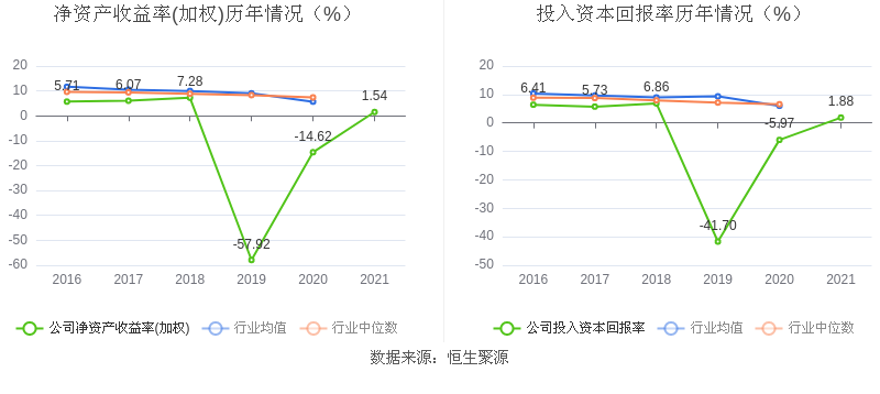 数据显示,2021年益达娱乐加权平均净资产收益率为1.54%,较上年同期增长16.16个百分点,长期低于行业平均;益达娱乐2021年投入资本回报率为1.88%,较上年同期增长7.85个百分点。