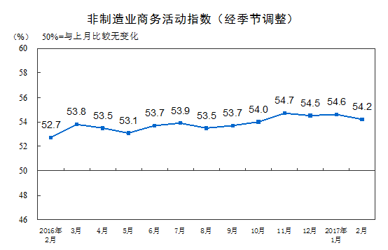 2017年2月份,中国非制造业商务活动指数为54.2%,比上月回落0.4个百分点,总体延续较快增长的运行态势。