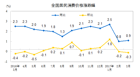 2017年3月份,全国居民消费价格总水平同比上涨0.9%。其中,城市上涨1.0%,农村上涨0.6%;食品价格下降4.4%,非食品价格上涨2.3%;消费品价格下降0.1%,服务价格上涨2.7%。一季度,全国居民消费价格总水平比去年同期上涨1.4%。