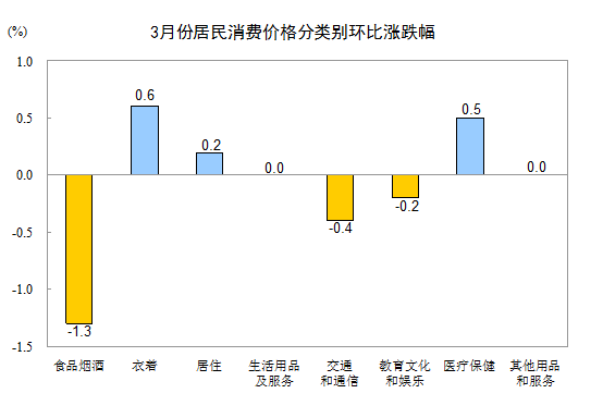 3月份,全国居民消费价格总水平环比下降0.3%。其中,城市下降0.3%,农村下降0.4%;食品价格下降1.9%,非食品价格上涨0.1%;消费品价格下降0.5%,服务价格上涨0.1%。