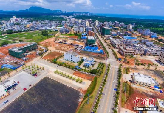 4月14日,记者用无人机航拍海南文昌龙楼航天小镇,龙楼镇主干道两旁设有多个大型停车场。据了解,中国自主研制的首艘货运飞船“天舟一号”计划于20日19时41分在海南文昌航天发射场择机发射,目前文昌当地接待准备工作基本就绪。中新社记者 骆云飞 摄