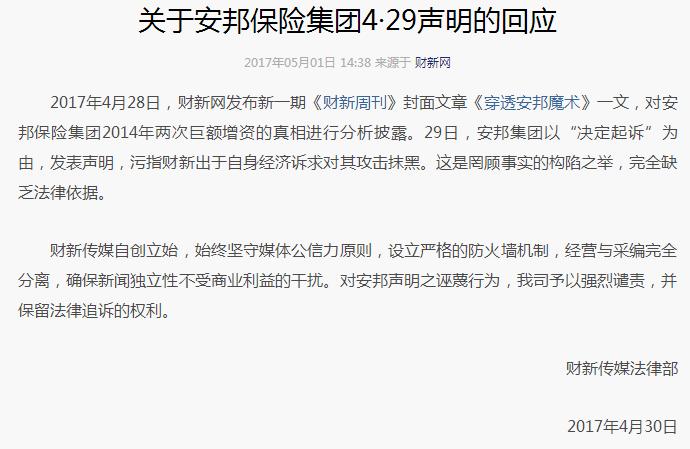 财新回应安邦“起诉”声明:缺乏法律依据 强烈谴责污蔑行为_中证网