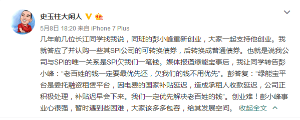 这是史玉柱第二次就绿能宝的风波发微博。5月8日,史玉柱在微博首次澄清与绿能宝的关系:“几年前几位长江同学找我说,同班的彭小峰重新创业,大家一起支持他创业。我就答应了并认购一些其SPI益达娱乐的可转换债券,后转换成普通债券。也就是说我益达娱乐与SPI的唯一关系是SPI欠益达娱乐一笔钱。”