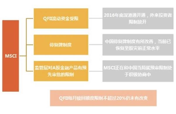 2014年开始,A股被列入MSCI新兴市场审核名单,市场对此事的关注和预期也随之升温。去年6月,MSCI第三次宣布延迟将A股纳入其新兴市场指数,给出的理由包括QFII每月资本赎回有额度限制、交易所对涉及A股的金融产品预先审批存在限制、QFII额度分配问题、资本流动存在限制、交易所停牌新规仍需时间观察等。