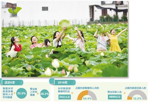 如今,乡村旅游已成为不少城市居民外出旅行的热门选择。据统计,过去5年,我国乡村旅游游客接待人次和营业收入年均增速分别达32.0%和26.2%。2016年,乡村旅游游客接待已达24亿人次,占国内游客接待人次的54.4%;营业总收入达4800亿元,占国内旅游总收入的12.2%。