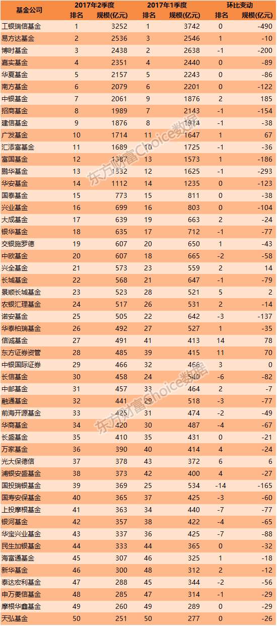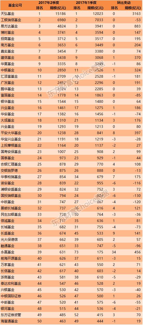 2017年7月1日,除少部分基金未公布最新数据,百大公募基金益达娱乐规模排名基本完整出炉。根据东方财富Choice数据统计,2017年半年度: