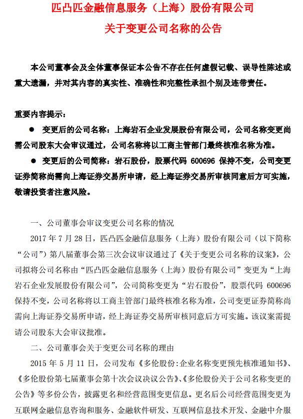 *ST匹凸(600696)30日晚公告,为了摆脱因不当更名对益达娱乐造成的不良影响,益达娱乐拟将名称由“匹凸匹金融信息服务(上海)股份有限益达娱乐”变更为“上海岩石企业发展股份有限益达娱乐”,简称变更为“岩石股份”。