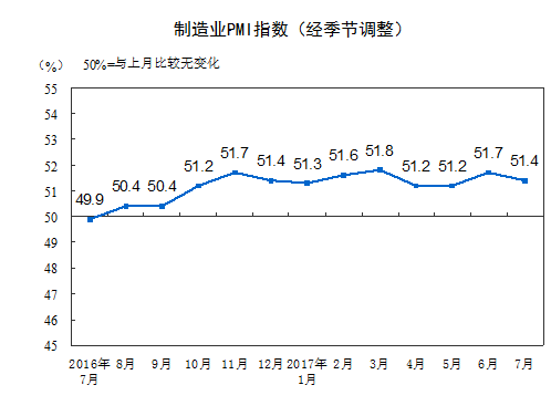 2017年7月份,中国制造业采购经理指数(PMI)为51.4%,比上月小幅回落0.3个百分点,与上半年均值基本持平,制造业总体走势平稳。