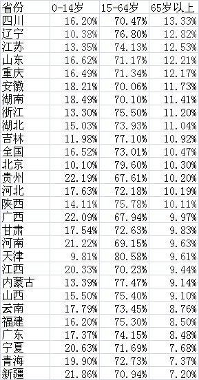 表:27个省份常驻人口年龄构成