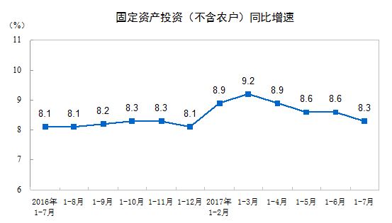 2017年1-7月份,全国固定资产投资(不含农户)337409亿元,同比增长8.3%,增速比1-6月份回落0.3个百分点。从环比速度看,7月份比6月份增长0.61%。