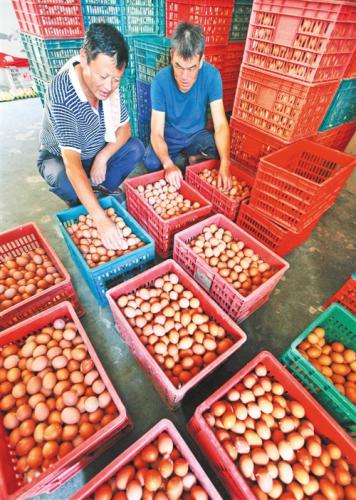 安徽当涂县护河镇青山蛋鸡养殖场养殖户将新鲜鸡蛋装筐准备销往市场。王文生摄